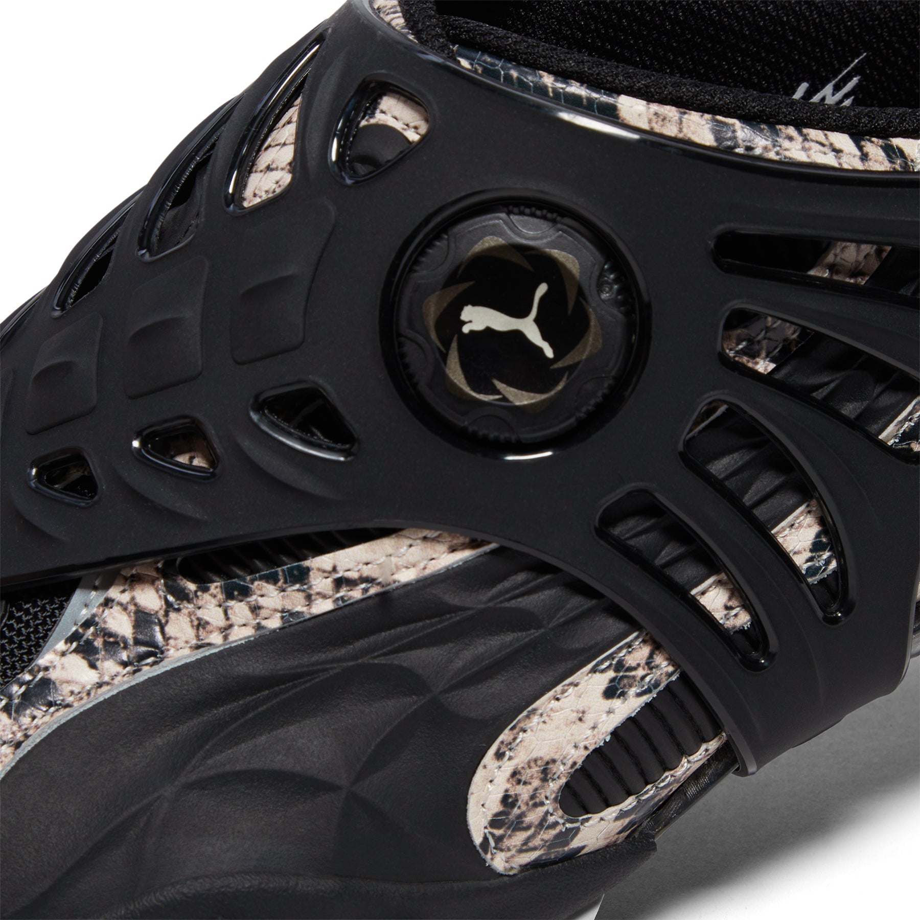 This is the Mostro Gabbia – A$AP’s bold evolution of the PUMA Mostro with a removable cage. This edition stands out with a snakeskin upper, daring cage overlays, and signature spiked sole, blending bold design with Rocky’s subversive vision.